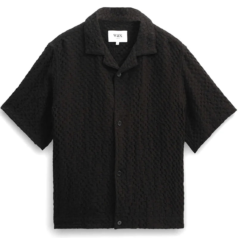 This short sleeve button-up shirt features a relaxed, boxy fit with a cropped length, crafted from 100% cotton dobby weave for a breathable yet textured feel. Designed with a camp collar, straight hem, and matching buttons, it offers a modern, casual look.