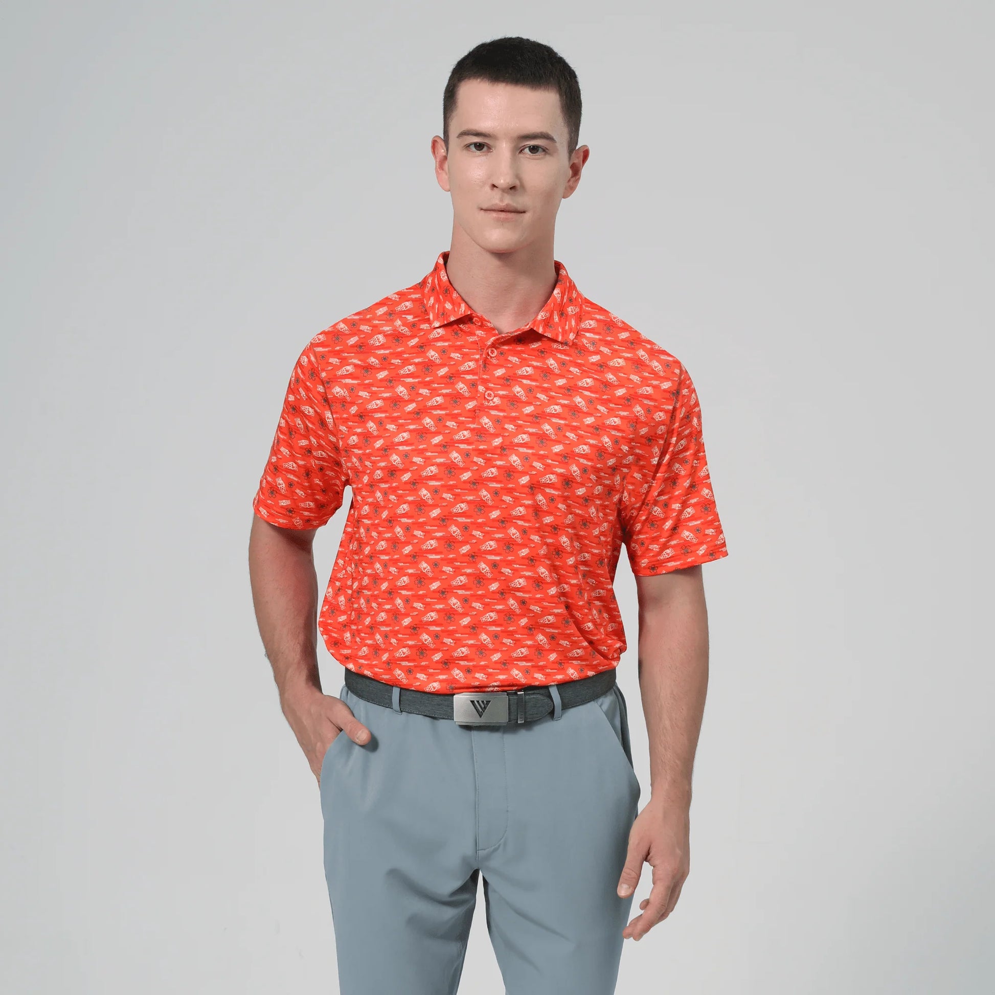 Men's short sleeve shirt made from 92% recycled polyester and 8% spandex for comfort and stretch. Designed with moisture-wicking, anti-bacterial properties, and UPF 50+ sun protection. Features include a self-fabric collar with built-in stay, forward shoulder seams, a high-low hem with side slits, and an all-over print for a modern look.