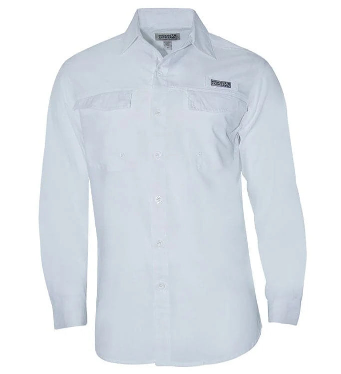 Made with 96% micro-filament polyester and 4% spandex for stretch and durability. Offers UPF 50+ sun protection, vented back, and moisture-wicking mesh lining. Features roll-up sleeves with tabs, secure pockets, and a utility loop for functionality.